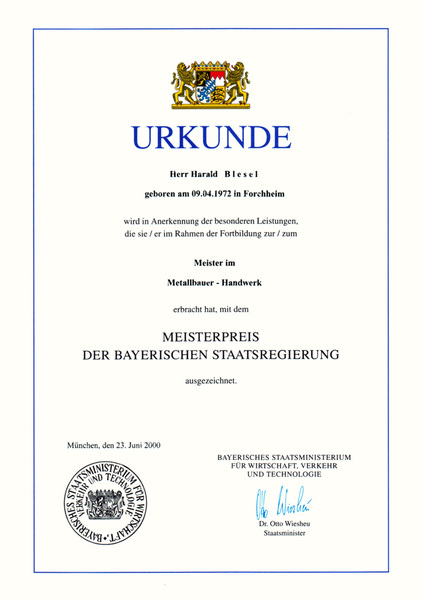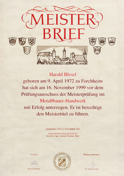Harald Blesel hat seine Ausbildung zum Bau- und Kunstschlosser 1990 erfolgreich absolviert. Danach konnte er einige Jahre Berufserfahrung sammeln und beschloss, den Meister im Bereich Metallbau zu machen. Die Meisterprüfung bestand er 1999 im Schlosserhandwerk bei der Handwerkskammer Nürnberg erfolgreich. Harald Blesel wurde als einer der Jahrgangsbesten mit dem Meisterpreis der Bayerischen Staatsregierung ausgezeichnet.